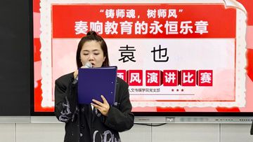 人文传媒学院党支部书记阚灵佳作开场致辞,她强调:"师德是教师的立身之本,师风是教育的灵魂所在。在培养担当民族复兴大任时代新人的征程中,我们要以'四有'好老师为标准,落实立德树人根本任务,夯实党建引领工作实际。"随后,她介绍了担任本次比赛的评委阵容——学校党委组织部副部长韦秋惠、党委宣传部负责人祝红颖、党委统战部负责人曾翔钰,以及人文传媒学院党支部书记阚灵佳、教研室主任王娜、李亚楠,六位评委将从演讲内容、语言表达、情感共鸣等多维度进行专业评审。支部组织委员黄胥卓担任此次活动的主持人并宣布相关比赛规则。