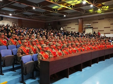 我校新兵代表任智斌发言,他代表全体新兵庄严承诺:将牢记家乡嘱托,珍惜军旅荣誉,服从命令、听从指挥,刻苦训练、锤炼本领,努力成长为有灵魂、有本事、有血性、有品德的新时代革命军人,以实际行动报效祖国、为家乡争光,用青春热血守护家国安宁。