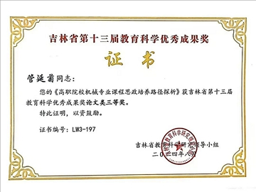 经吉林省教育科学研究领导小组评审,我校管延菊老师撰写的《高职院校机械专业课程思政培养路径探析》论文,获吉林省第十三届教育科学研究优秀成果奖论文类三等奖。