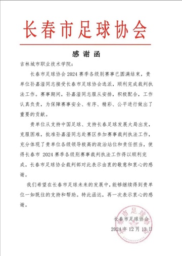 近日,长春市足球协会给我校发来感谢信。在长春市足球裁判培训工作中,我校学生孙嘉滏接受长春市足球协会选派,顺利完成裁判执法工作。信中,长春市足球协会对我校孙嘉滏为保障赛事安全、有序、精彩、公平做出重要贡献而表示诚挚的敬意和衷心的感谢。