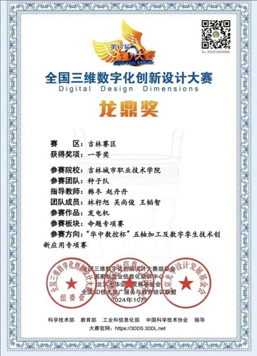2024 年 10 月 20日,由科学技术部、教育部、工业信息化部主导、吉林工程技术师范学院承办的 2024 年“华中数控杯”五轴加工及数字孪生技术创新应用专赛成功落下帷幕。本赛项是我校第二次参赛,我校机电工程学院学生田磊、温嘉鑫、刘嘉琦(指导老师:刘圳波、李研);林籽旭、吴尚俊、王韬智(指导教师:韩冬、赵丹丹)荣获 2024 年“华中数控杯”五轴加工及数字孪生技术创新应用专赛两项一等奖。