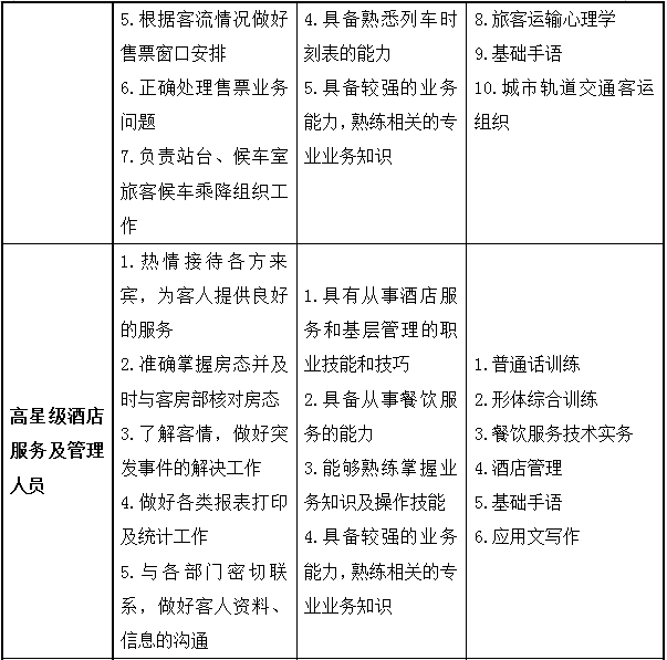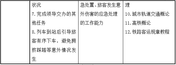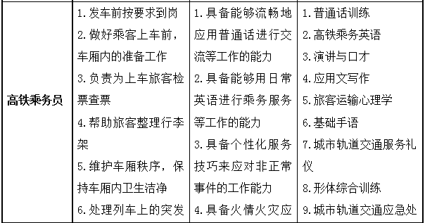 该专业毕业生的核心能力包括高速铁路动车乘务服务的能力;与乘客沟通和交往的能力;用英语与人沟通的能力;列车安全应急处理、常规操作和日常维护的能力;具有乘务服务礼仪和化妆的能力;获得相应的职业资格证书或技术等级证书,并达到相应的技能水平。通过3年学习,学生知识结构、技能结构与态度要求如下: